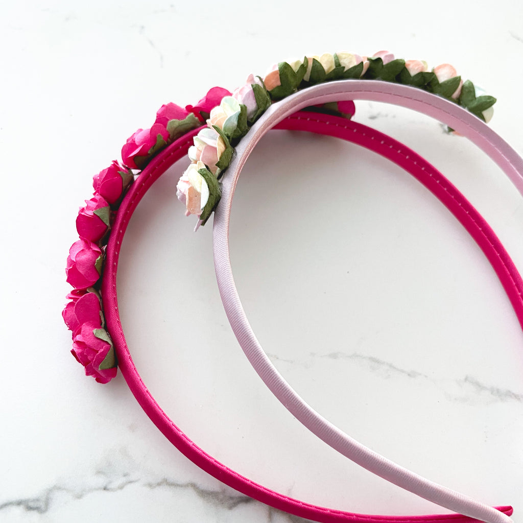 - has pastel rainbow flowers attached securely to the headband Ready to ship.